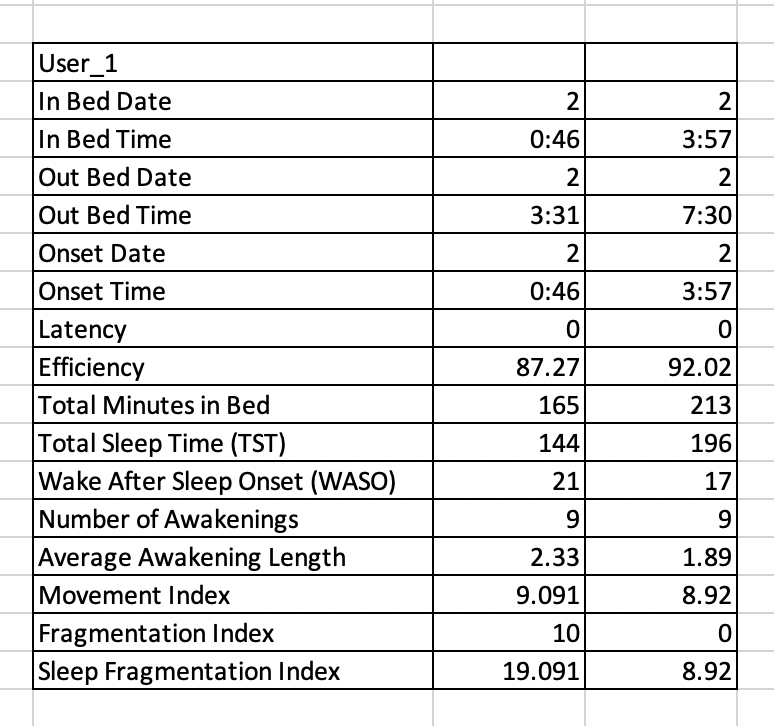 Every user once in bed (to sleep) doesn’t get out of bed till morning except one. Sleep records of user 1 showed that he got out of bed at 3:31 AM and went back to sleep at 3:57 AM. For simplification, we treated the time interval that the user was out of bed as an “awakening” i.e. when a user awaken from his sleep and remains awake for some time. This required updating the rest of the variables and depending on the definition , we either took the average or maximum or summed the two quantities corresponding to each of the “sleep sessions”. For example, “Total Sleep Time” was now the sum of the sleep time in both sessions, while “Sleep Fragmentation Index” was averaged across sessions.