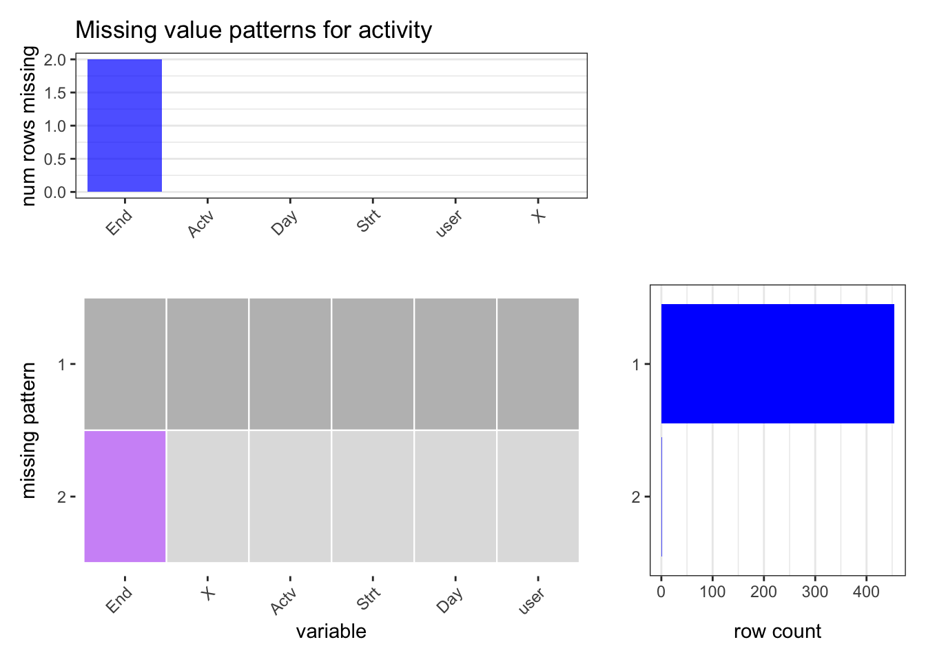 As shown in the plots, only one row with missing values exist in activity