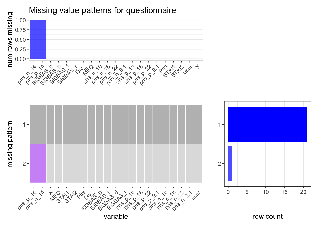 Here we revise the function we created in problem set 4 to plot the missing patterns. The number of missing values are very few (mentioned above). We generated missing value plots only for questionnaire