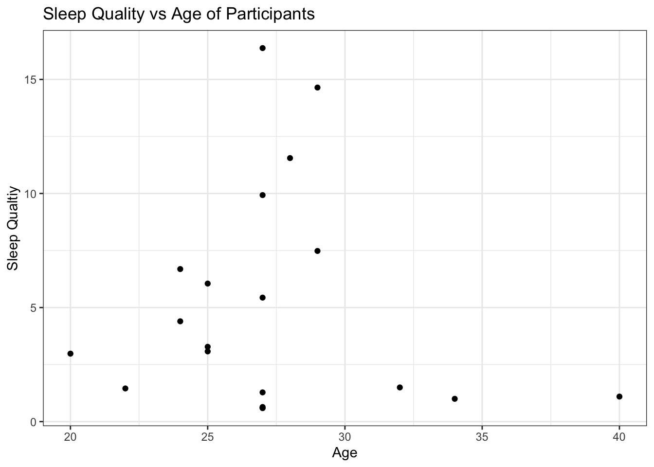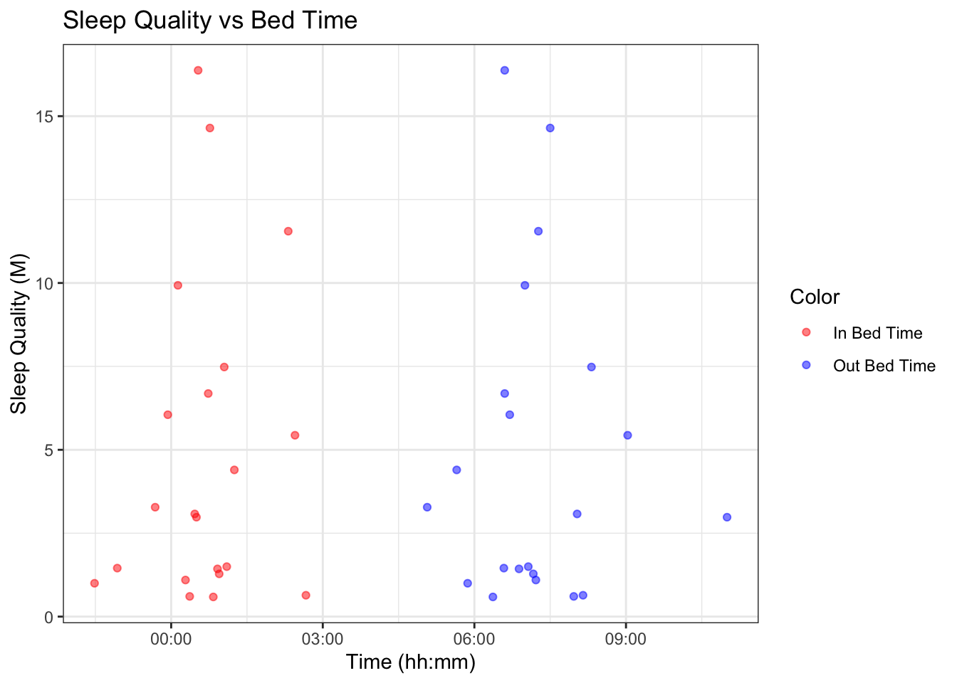 We generated a scatterplot and concluded that bed time does not have affect sleep quality. There is no linear relationship; some participants who went to bed later than “usual” have a higher sleep quality than most participants who went to bed early. Similar conclusion can be made for the time a participant got out of bed. The data has high variance and so we cannot conclude that bed times and sleep quality are related.