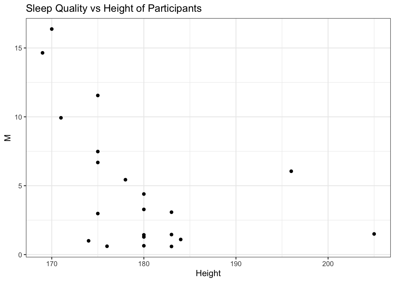 Next, we wanted to see if taller people sleep better or not. Similar to the ages, height of users is also skewed. However, we still see close to a linear relationship with a negative slope between M and height till 190 cm. One reason could be, it is easier for short people to get comfortable in bed and that helps them sleep better. We did not categorize users as outliers due to small sample size and low diversity.