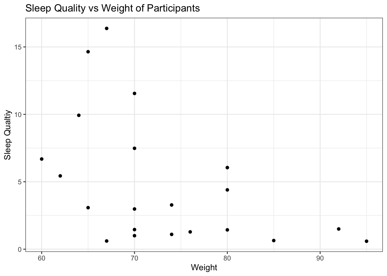 We then moved on to see if weight affects sleep quality. As expected, there seems to be no direct relationship between the two. The scatterplot shows the spread of the data which doesn’t have any discernible pattern. Users with weight 70 kg and 80 kg have a range of values for sleep quality.