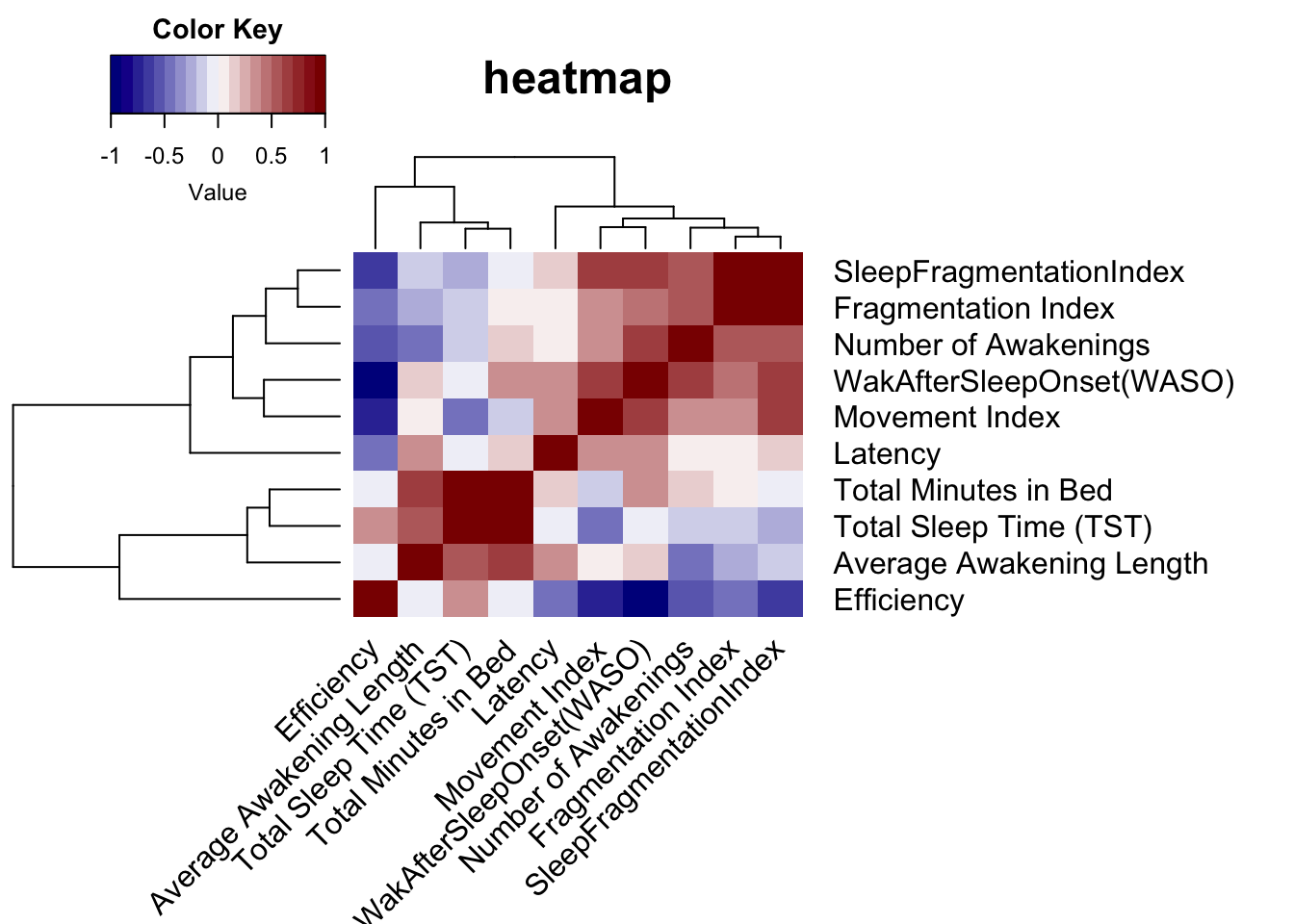 There are 3 clusters in the heatmap (if we cut across the tree right below the highest line connecting efficiency and another cluster) which are consistent with the observations we made. To avoid multicollinearity, we picked variables from each of the clusters depending on the strength and significance of the correlation coefficient. We denote our metric by M. Intuitively, it should be higher for users who are able to sleep through the night and do not have any trouble falling asleep. Keeping this in mind, we came up with the following associations -
