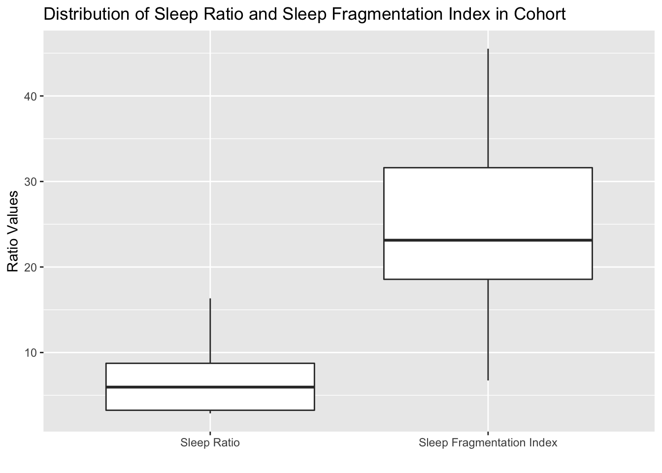The box plot below shows the distribution of the Sleep Ratio and Sleep Fragmentation Index. The values for both ratios seems well distributed with no outliers.