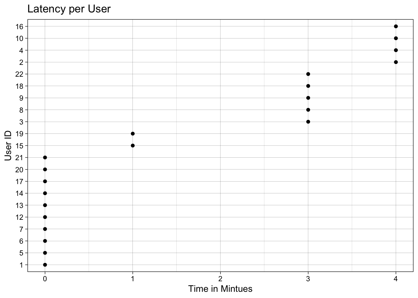 Since Latency is not a ratio, we visualized it separately as a Cleveland dot plot. There are a lot users with latency time of 0 mins which is a problem since M is inversely proportional to latency. So, we added a dummy term to latency and replaced proportionality with equality (we assume proportionality constants to be 1 - discussed in Conclusions chapter)
