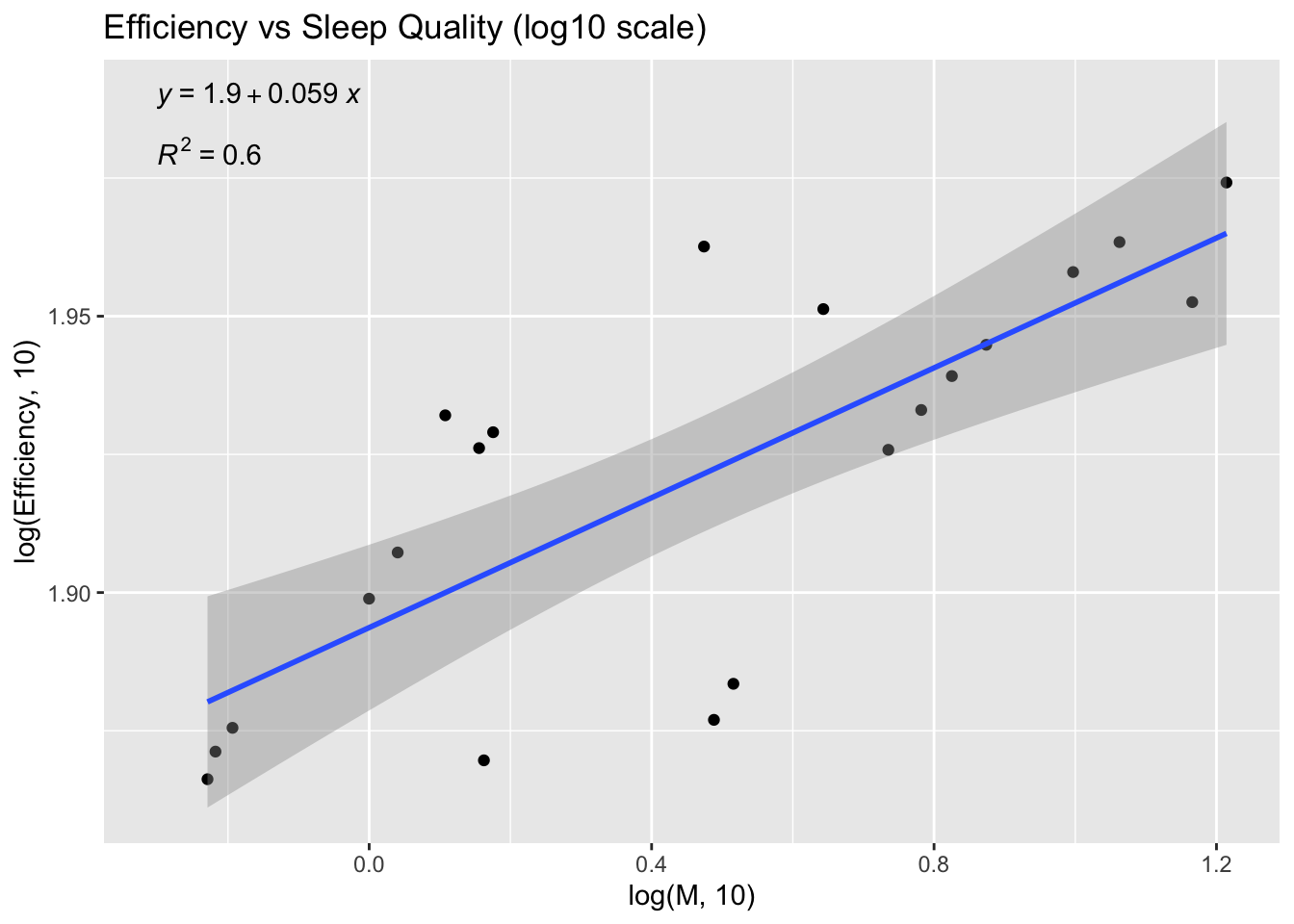 To test the relationship, we generated a log-log scale plot. We used a log10 scale to normalize the values and to see how the magnitudes of the two variables are related. The regression model is statistically significant with a p-value of 3.681e-05. Positive slope suggests that as M increases, efficiency also increases. However, the adjusted R square value is 0.6 which means that the model captures less than 70% of the variance.