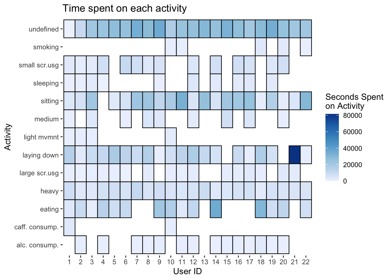 , we explored the correlation between the sleep quality metric and the total time each user spent on each activity throughout the day. We generated a heatmap of the time each user spends on each activity. The blank spaces mean that the user did not engage in that activity at all. Initially, we were curious about alcohol and caffeine consumption but the amount of data was too less to analyze. We decided to discuss screen usage and heavy activities.