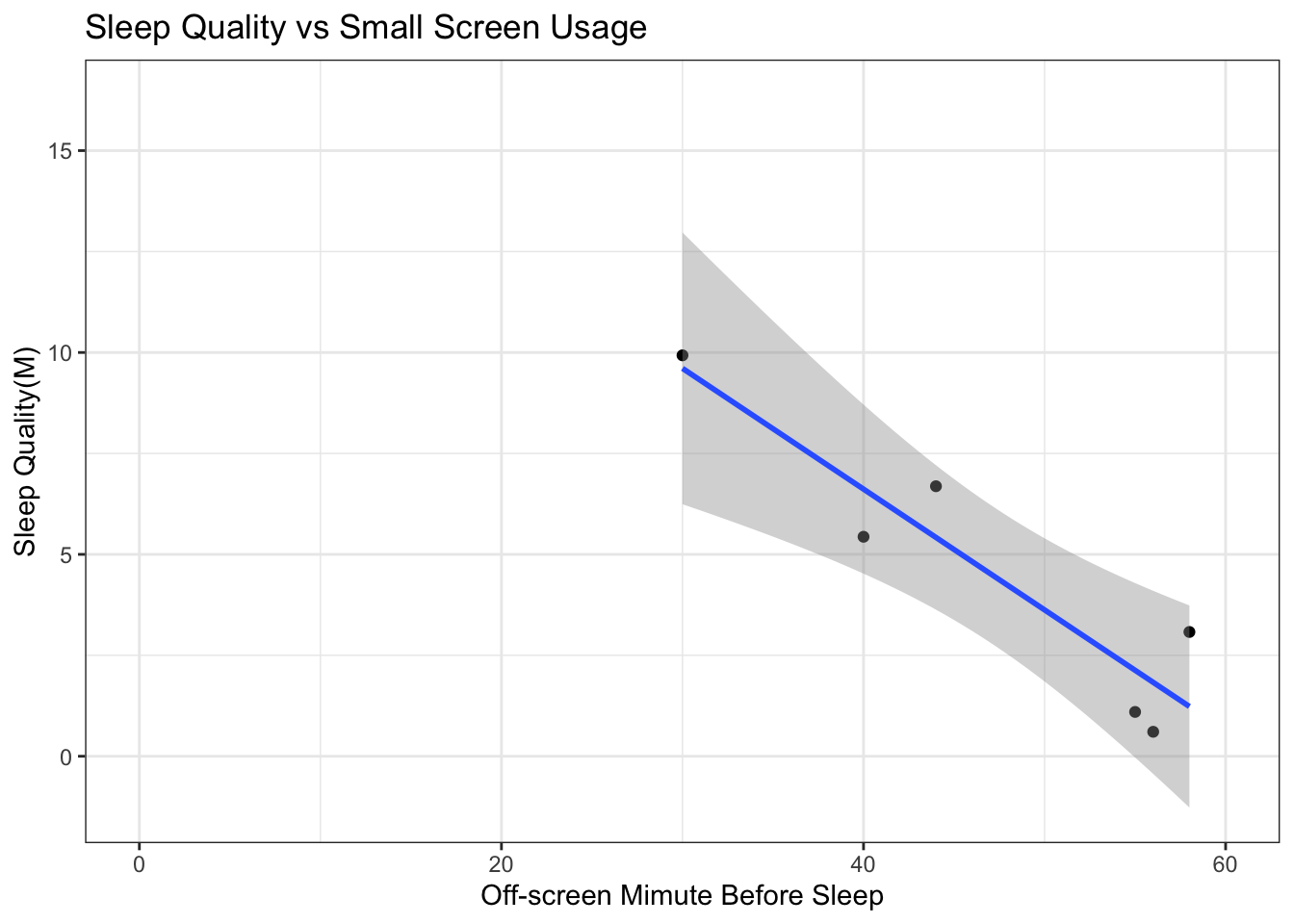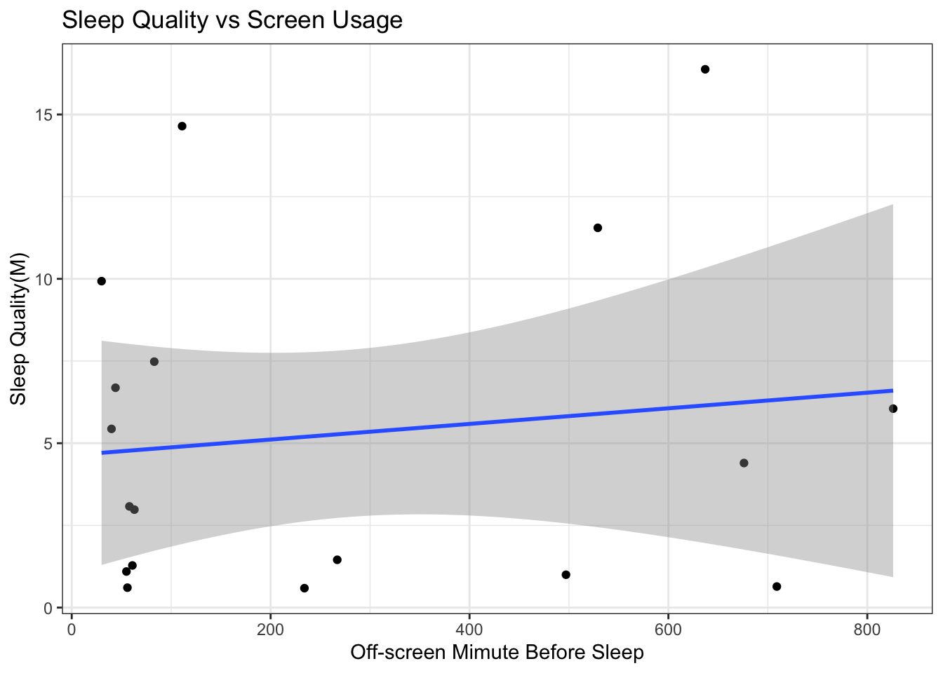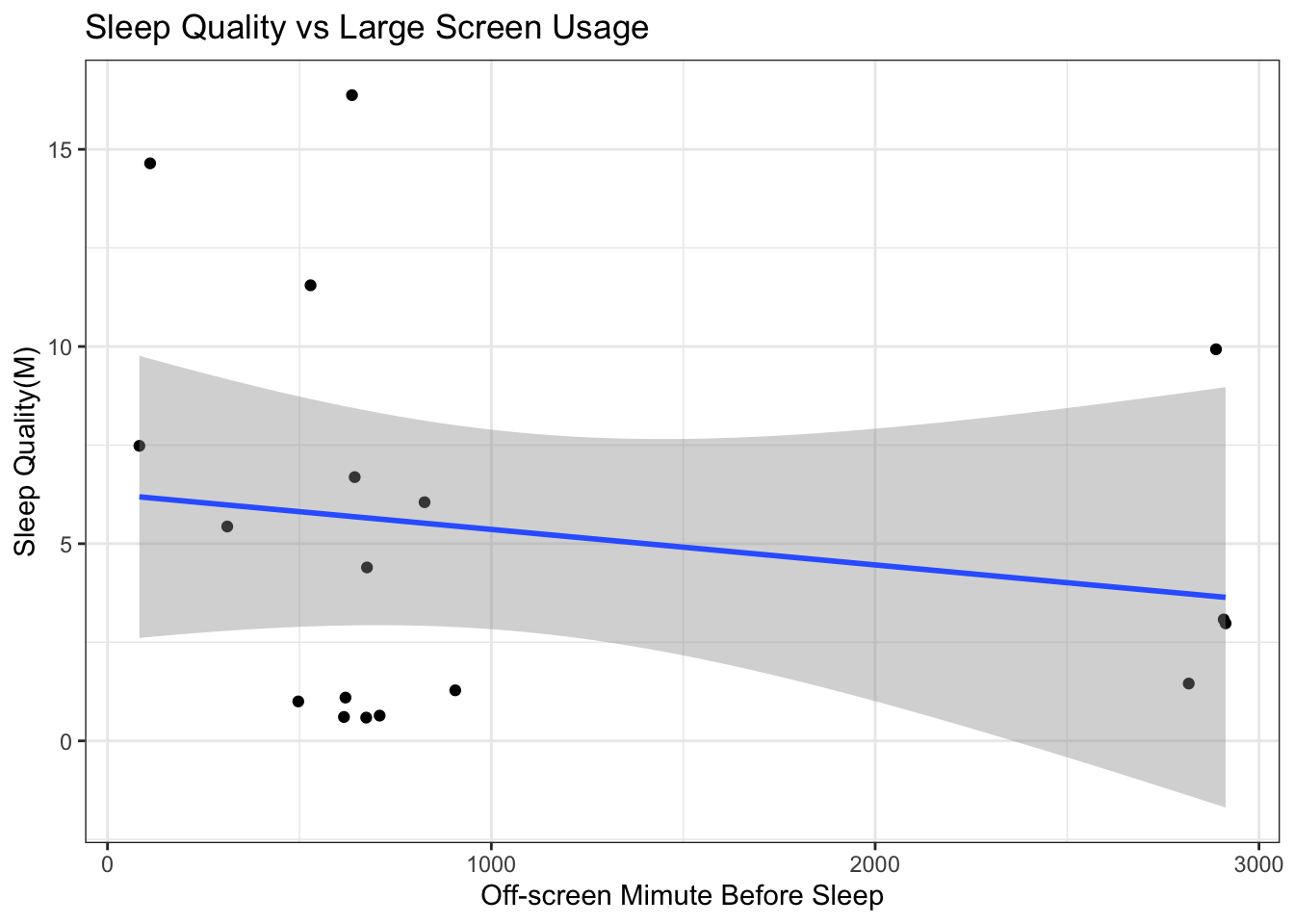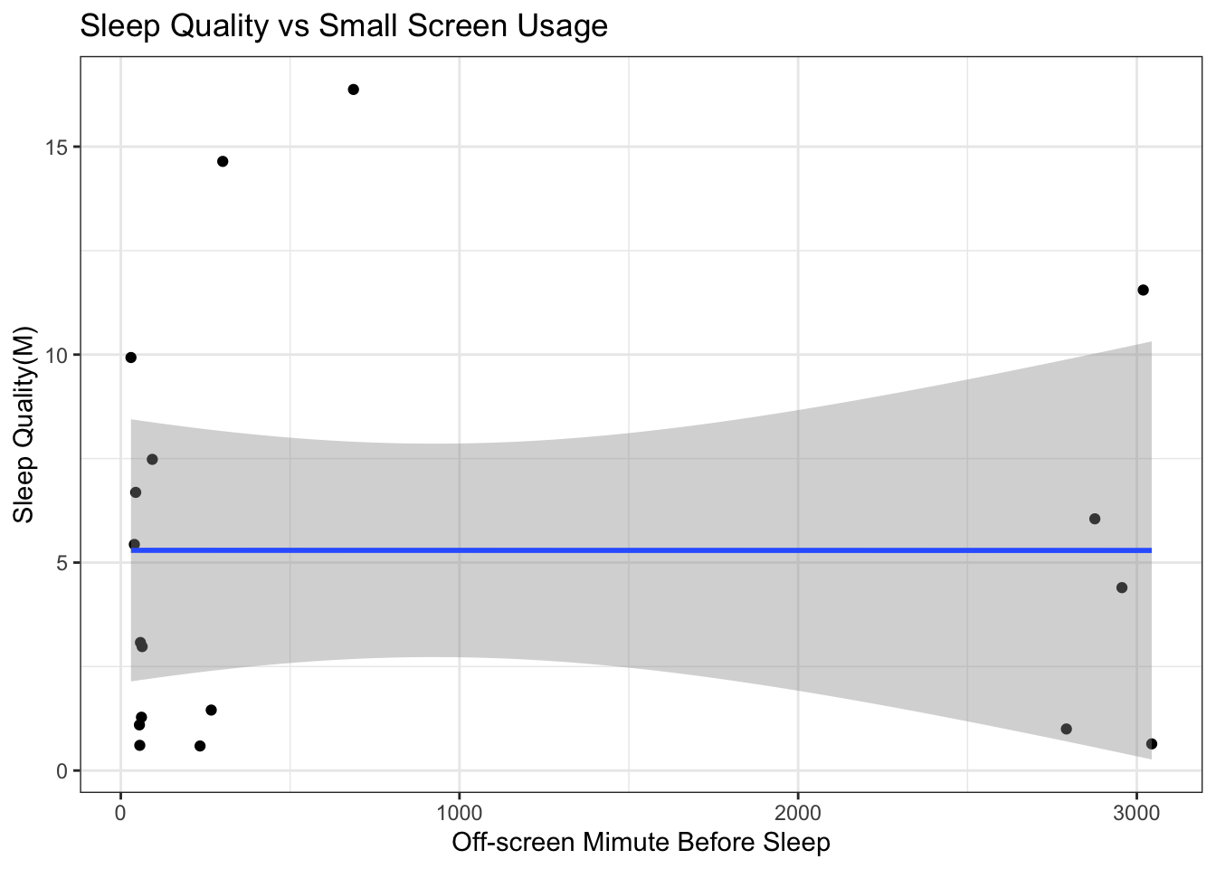 To dig deeper, we looked at the relationship between the amount off-screen time the user has right before sleeping and the sleep metric. We expected to have a positive linear relationship. However, from the regression lines below we see that the relationship is neither linear nor positive. Plot with averaged small and large off-screen time is comparatively closer to our expectations but the standard errors are too large to ignore.