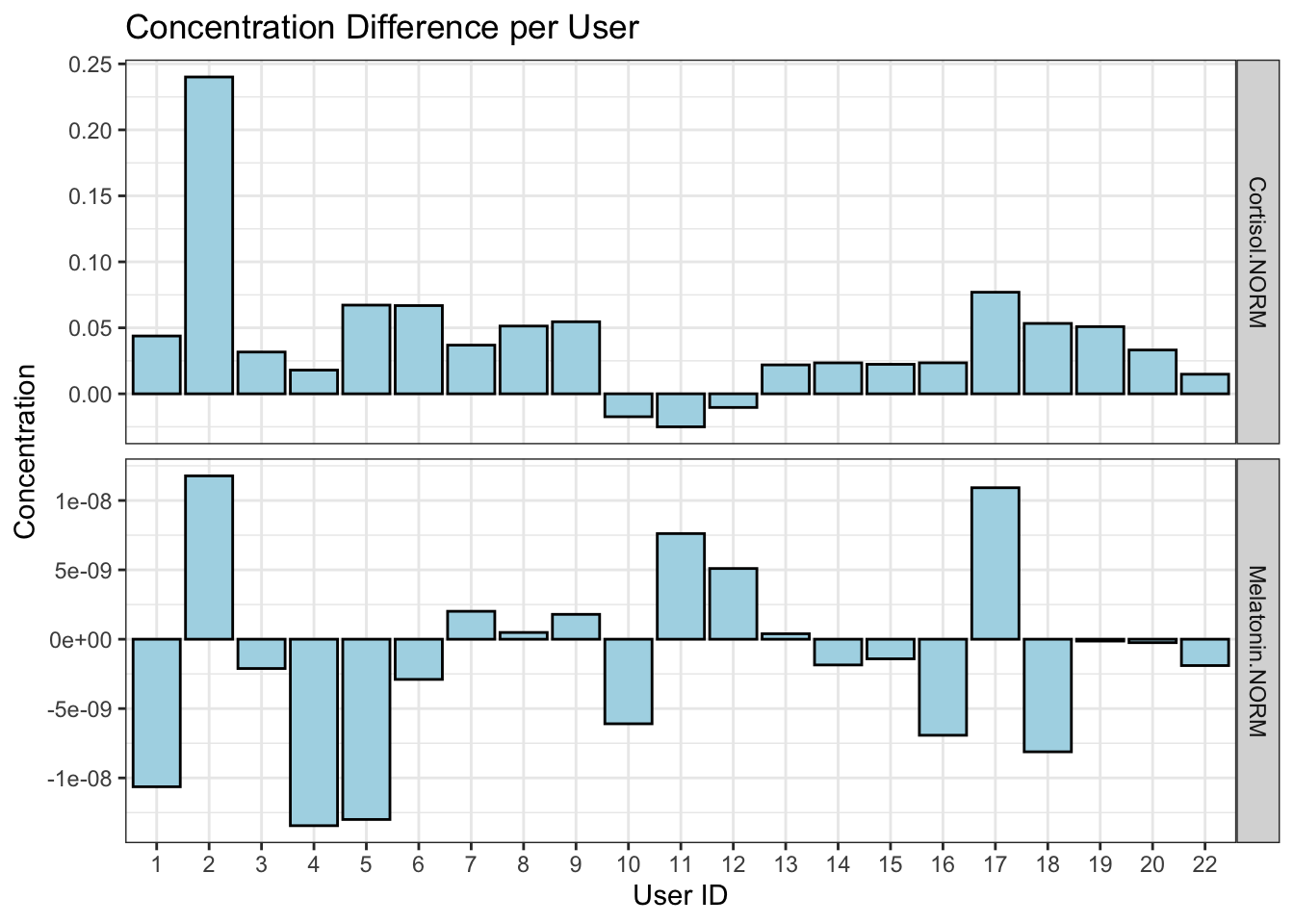 We wanted to see if our metric is able to capture the presence of prerequisites or not. We plotted a bar graph of differences in concentration (before sleep - after sleep) for each of the hormones and users. Concentrations of melatonin run in \(10^{-9}\) and so the differences are not small, given the scale. We saw that only three users have negative cortisol difference levels.